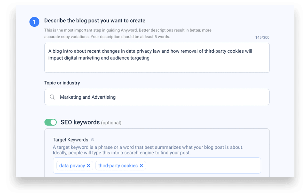 Let’s look at a real-life example putting AI writing to the test. We used part of an Aker Ink blog entitled “How to Navigate Data Privacy Laws to Target Digital Audiences in a Cookie-Less World,” which aimed to educate readers on how new data privacy regulations and the elimination of third-party cookies would impact digital marketing strategies.