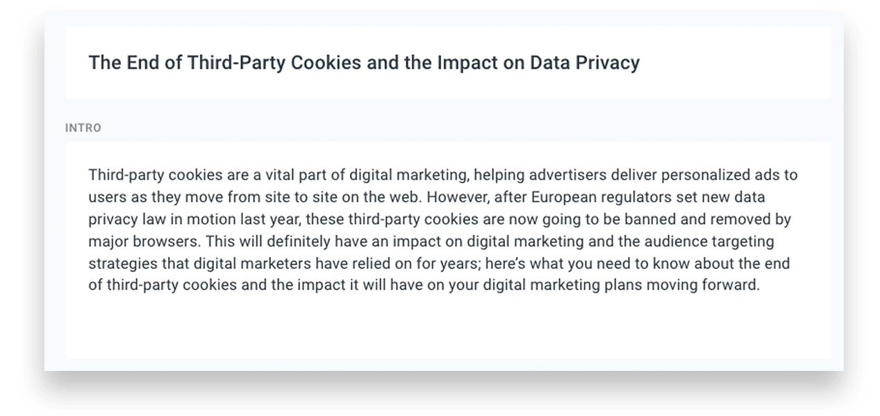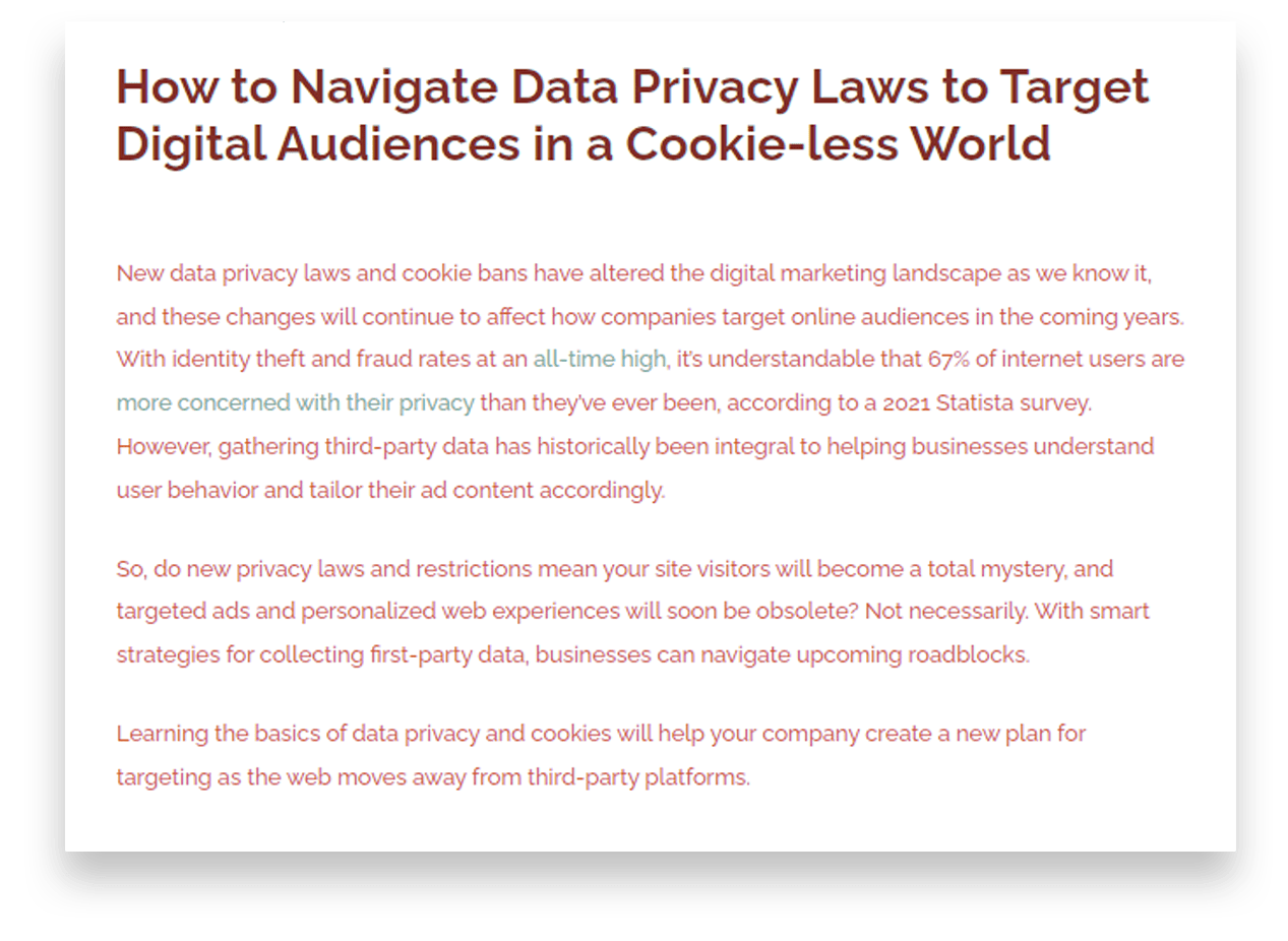 You’ll also notice the title doesn’t align with the blog’s goal. While it is true the end of third-party cookies will impact data privacy, the focus should be on how changes in data privacy laws, including the end of third-party cookies, will impact digital marketing. See the disconnect?