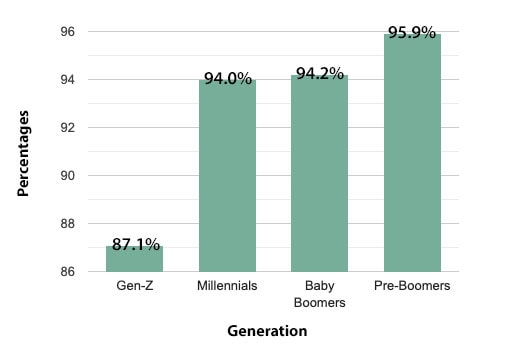 Along with geography, age also impacts attentiveness to grammar and spelling. Turns out the older we get, the more we care. Here’s how much each generation considers themselves to be grammar conscious: